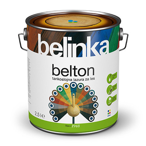 Belton je tankoslojna lazura, ki les ščiti pred vremenskimi vplivi, obenem ga tudi obarva in oplemeniti njegovo površino. Z njim zaščitimo zunanje dele ostrešij, fasadne obloge, ograje, vrtne lope, vrtno pohištvo in druge lesene elemente zunaj in znotraj stavb, kadar želimo, da bo po premazovanju struktura lesa vidna, končni videz površin pa rahlo matiran. Na voljo je v 17 standardnih barvnih tonih, nanaša pa se v treh slojih. Poraba: 1 l za 10 - 12 m2 pri treh slojih (odvisno od vrste in kakovosti lesa, površinske obdelave ter načina nanašanja) Sušenje: naslednji nanos po 24 urah (pri normalnih pogojih) Čiščenje orodja: z Belsolom ali white spiritom.