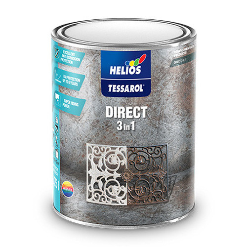 TESSAROL DIRECT 3in1 je antikorozijski pokrivni premaz za dekoracijo in zaščito železnih in jeklenih površin v notranjosti ali na prostem. Zaradi odličnega oprijema se lahko uporablja tudi za starano pocinkano pločevino in trdi PVC. Lahko se nanaša neposredno na suho in obrušeno površino, očiščeno grobih delcev rje. Zaradi odličnih antikorozijskih lastnosti se lahko nanaša direktno na površino brez temeljne barve. Na pobarvani površini tvori sijajni zaključni premaz, hkrati pa je površina zaščitena pred rjavenjem.