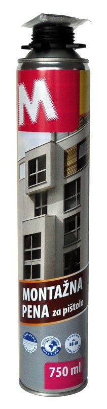 M montažna pena je enokomponentna poliuretanska pena, ki hitro utrjuje s pomočjo zračne vlage, med utrjevanjem pa se ji za 2-3 krat poveča volumen.