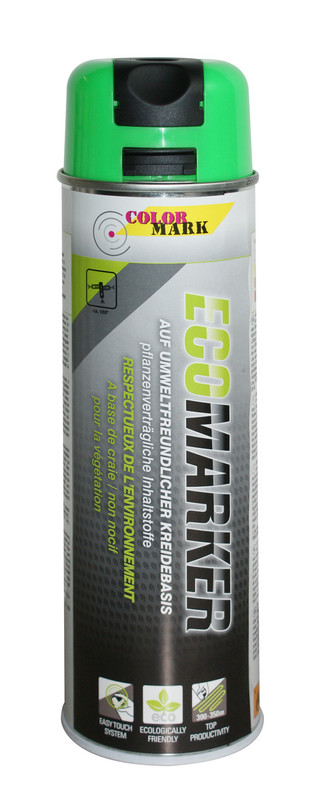 Sprej COLORMARK Ecomarker je idealen za označevanje tal, kadar želimo, da označbe ostanejo vidne le kratek čas (npr. Za športne prireditve, sejme, prepoznavanje krajev nesreč). Zahvaljujoč posebni osnovi s kredo, oznaka drži le nekaj dni do tednov in hitro izgine v daljšem obdobju dežja ali na območjih z velikim prometom. Zaradi vsebin, ki niso nevarne za rastline, je idealen tudi za vrt in urejanje okolice ter za šport in igrišča za golf. Še posebej okolju prijazen zaradi uporabe izbranih sestavin.
